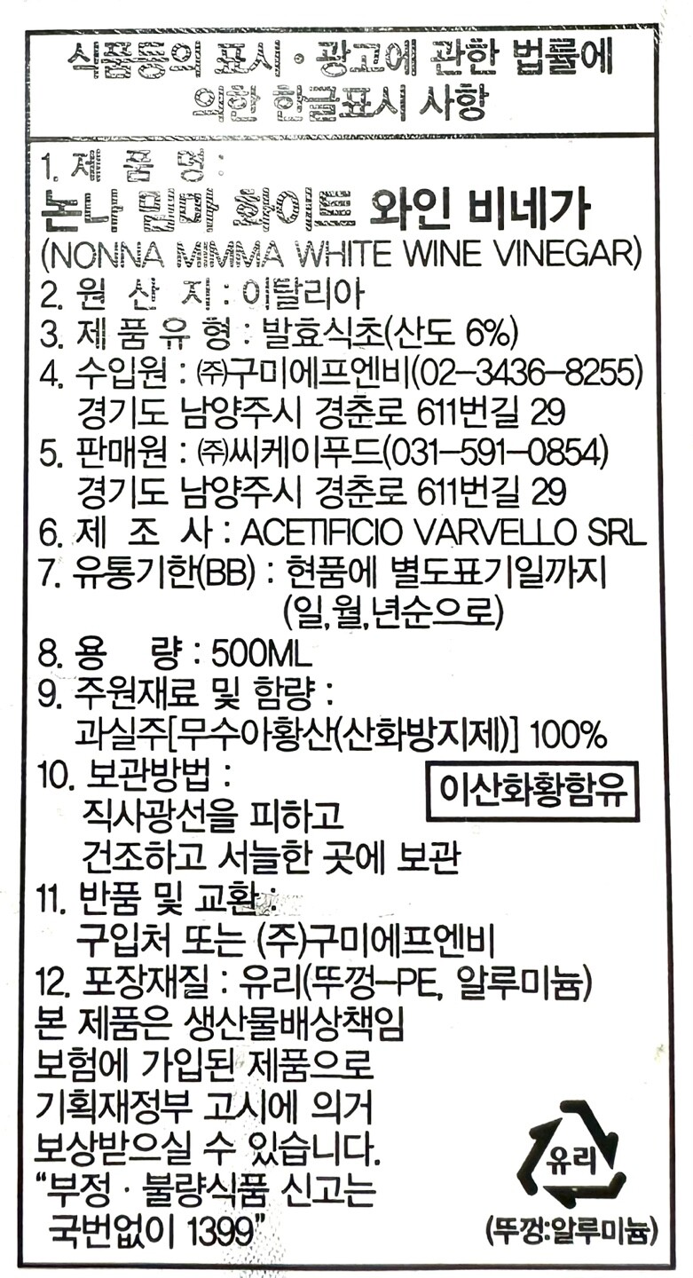 [논나 밈마] 화이트 와인 비네거 500ml