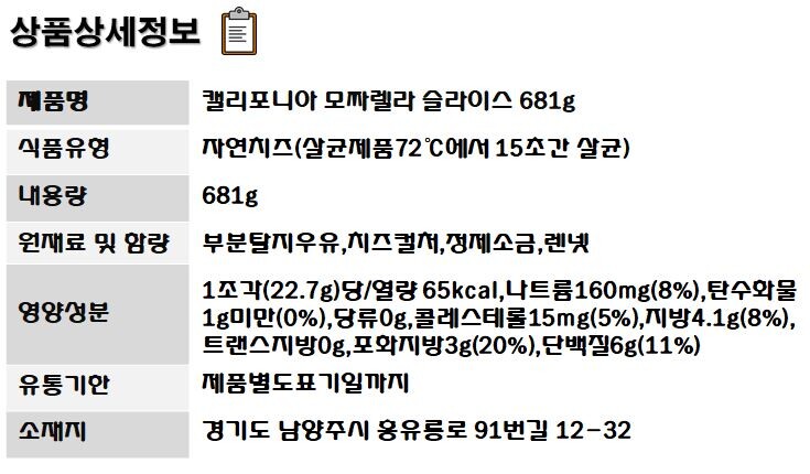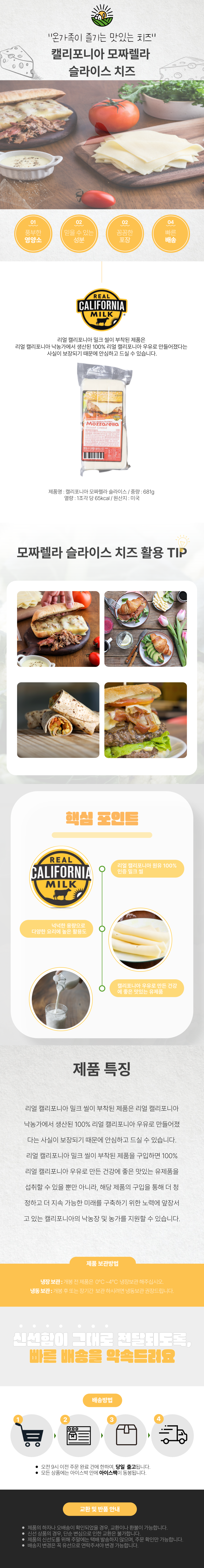 캘리포니아 청정 원유로 지방함량이 적은 원유를 가지고 만든 모짜렐라 치즈를 슬라이스한 제품으로 짜지 않고 부드러운 질감과 고소한 맛이 일품입니다.