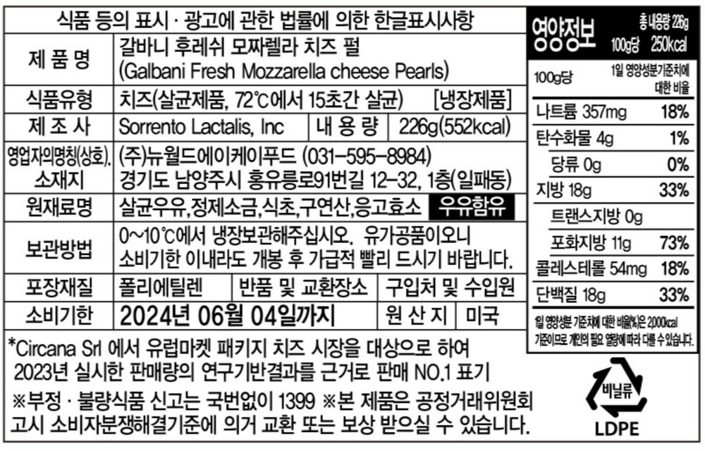 [Galbani]갈바니 후레쉬 모짜렐라 펄 226G