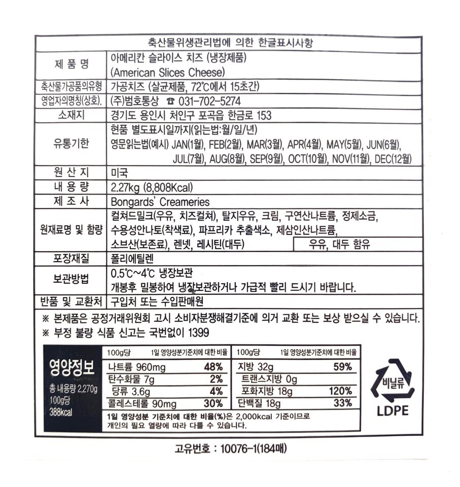 184매 슬라이스 저염 치즈로 맛은 부드럽고 고소하며 치즈는 서로 달라 붙지 않아 분리하는데 어려움이 없어 햄버거, 샌드위치 , 카나페 등 다양한 요리에 사용하기 좋습니다.