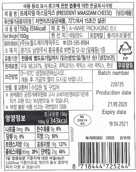 프레지덩 마스담 슬라이스 치즈 150G